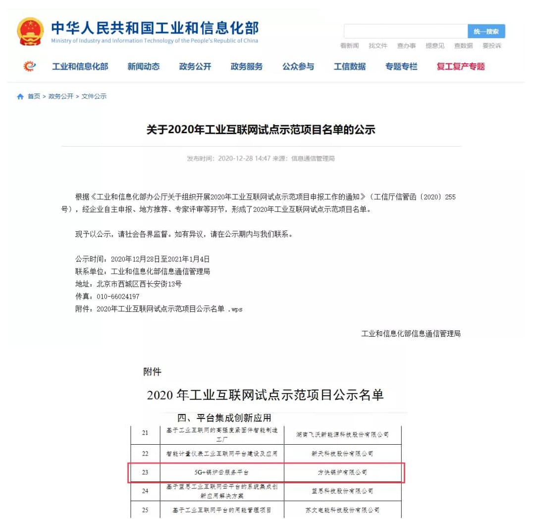 12月28日,由國(guó)家工信部公示了2020年工業(yè)互聯(lián)網(wǎng)試點(diǎn)示范項(xiàng)目名單。方快鍋爐有限公司申報(bào)的“5G+鍋爐云服務(wù)平臺(tái)項(xiàng)目”憑借過硬的技術(shù)平臺(tái)和超前的行業(yè)運(yùn)作模式成功入圍。