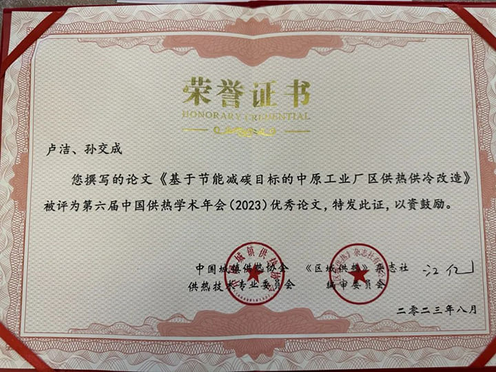 經(jīng)過中國(guó)工程院院士江億教授和30位供熱行業(yè)專家的嚴(yán)格審核和精心評(píng)價(jià),我司研發(fā)經(jīng)理盧潔撰寫的論文《基于節(jié)能減碳目標(biāo)的中原工業(yè)廠區(qū)供熱供冷改造》最終被評(píng)為“第六屆中國(guó)供熱學(xué)術(shù)年會(huì)(2023)優(yōu)秀論文”,同時(shí)入選《中國(guó)供熱學(xué)術(shù)年會(huì)論文(2023)》電子版U盤。