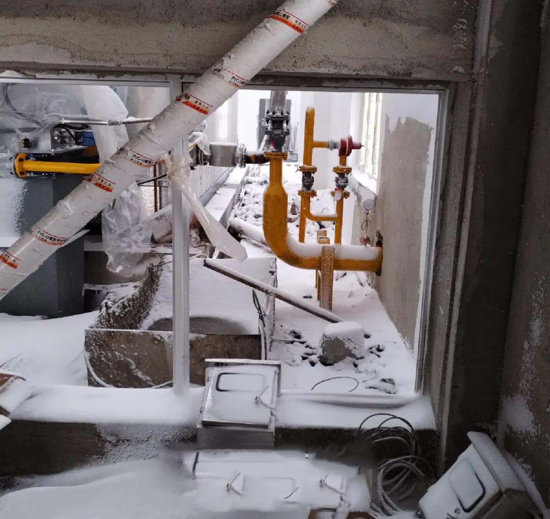 項(xiàng)目地全天持續(xù)下雪,由于沒有房頂和門窗,各施工環(huán)節(jié)都受到影響。整個鍋爐房已被積雪覆蓋并上凍,尹工現(xiàn)場指導(dǎo)安裝公司工人放線,并進(jìn)行控制箱整改。