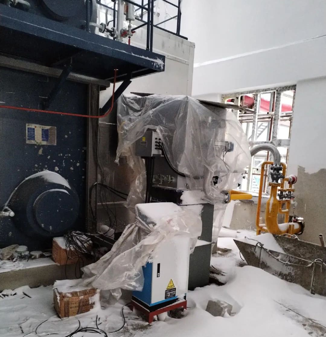 尹工到達(dá)現(xiàn)場后,得知用戶已聯(lián)系了當(dāng)?shù)厝細(xì)夤居?號下午送氣,當(dāng)天就要求進(jìn)行點(diǎn)火測試。時間緊,任務(wù)重,所有的電纜尚未鋪設(shè),現(xiàn)場還在施工階段,鍋爐房房頂未封頂,未安門窗,四面透風(fēng)。下午4點(diǎn)以后,鍋爐房光線已非?;璋?,尹工在劉志偉,袁凱兩位同事的配合下,頂風(fēng)冒雪,用手機(jī)照明,鋪設(shè)燃燒器接線箱與燃燒器控制柜之間的線纜并接線,與電氣科同事及燃燒器廠家及時溝通,增加風(fēng)機(jī)變頻柜頻率反饋信號,并重新設(shè)置變頻器參數(shù),排除各項(xiàng)困難,于晚上8點(diǎn)點(diǎn)火成功,按時完成了用戶的要求。