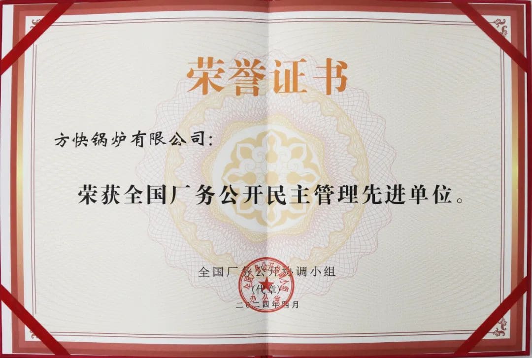 近日,全國廠務公開協調小組印發(fā)《關于表彰2021-2023年全國廠務公開民主管理工作先進單位的決定》,方快鍋爐榮獲“2021-2023年全國廠務公開民主管理先進單位”榮譽稱號。
