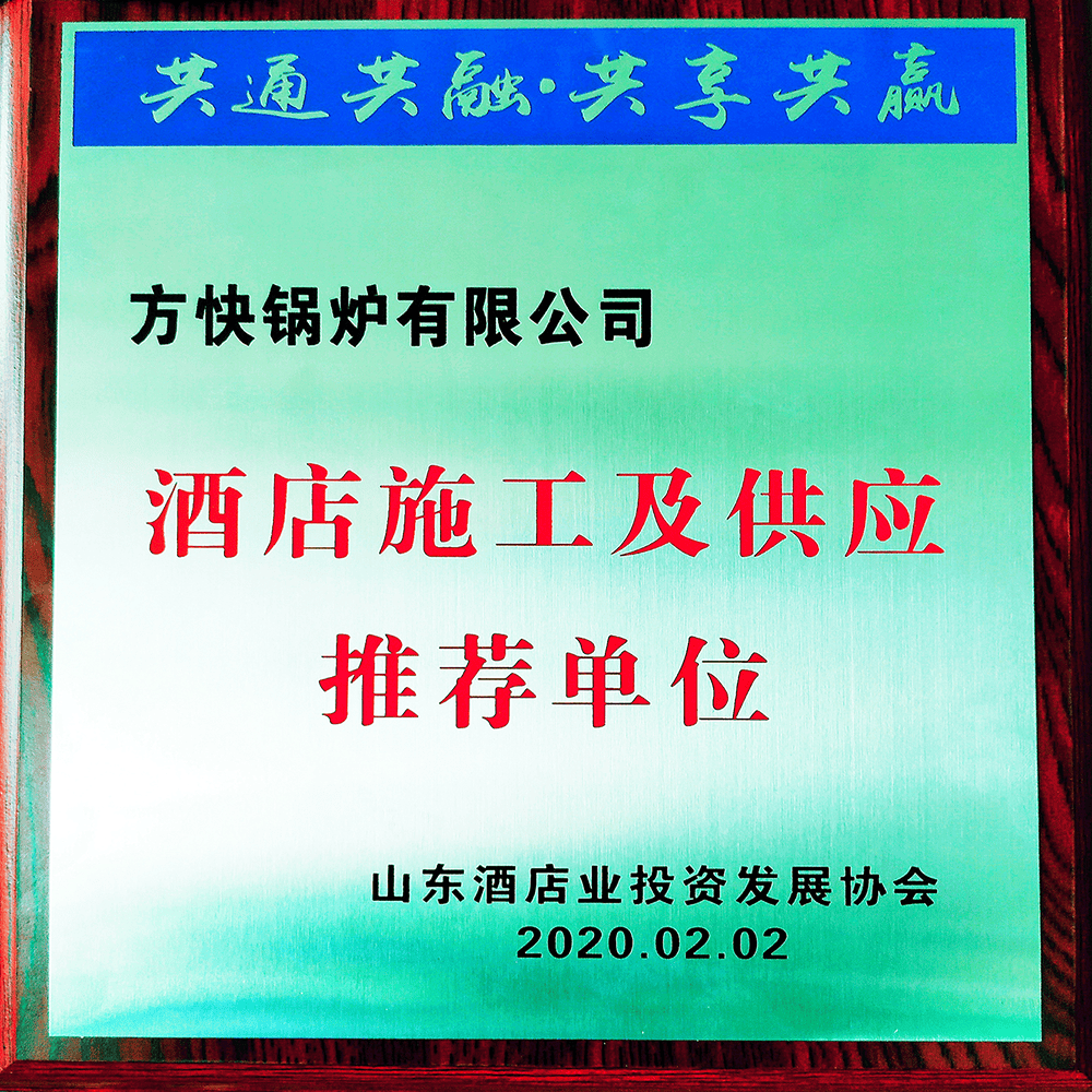 商用全領(lǐng)域熱水解決方案提供者——方快,專注熱水及采暖,深耕酒店行業(yè),為國內(nèi)眾多大中型知名酒店提供了熱水系統(tǒng)項目的建設(shè)和改造。 2020 年 2 月份方快榮獲了山東酒店業(yè)投資發(fā)展協(xié)會頒發(fā)的“酒店施工及供應(yīng)推薦單位”榮譽稱號。
