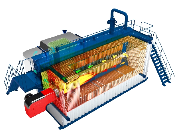 在火管鍋爐中,燃燒器產(chǎn)生的高溫煙氣流過被水包圍的螺紋煙管,對煙管壁外的水、汽或汽水混合物進行加熱,產(chǎn)生蒸汽或熱水。