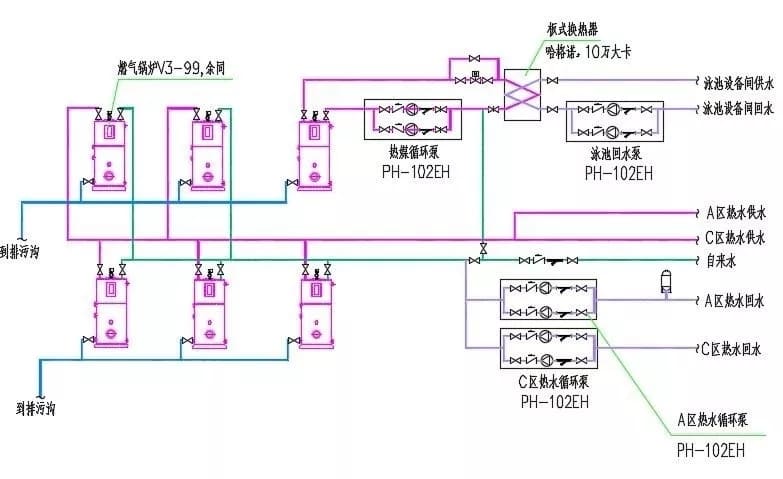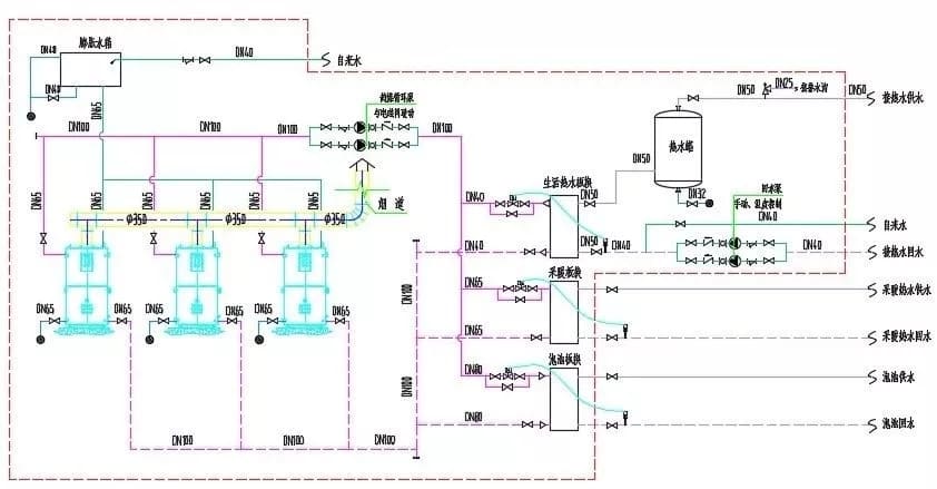 熱水系統(tǒng)圖,熱源由5臺(tái)方快V3-99容積式加熱機(jī)組提供。該系統(tǒng)與常壓熱水系統(tǒng)相比省去了膨脹水 箱、