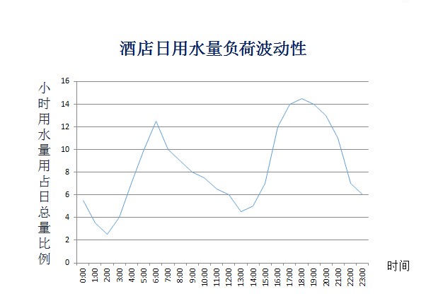 由于經(jīng)濟(jì)型酒店以客房服務(wù)為主的特點,以及入住率的影響,導(dǎo)致酒店全天的熱水用量負(fù)荷波動較大,用水較為集中,會出現(xiàn)兩個高峰階段(早高峰、晚高峰),高峰用水量占總用水量的 70%~80% 。