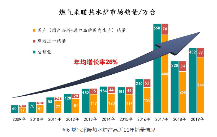 根據(jù)統(tǒng)計數(shù)據(jù),自 2009 年以來燃?xì)獠膳療崴疇t產(chǎn)品銷量急劇上升,中國國內(nèi)市場 2009 年銷量為 50 萬臺(原裝進(jìn)口 13 萬臺),截至 2019 年底,國內(nèi)市場銷量達(dá)到了 402 萬臺(原裝進(jìn)口 58 萬臺),年均增長率達(dá) 26% ,遠(yuǎn)遠(yuǎn)超出中國經(jīng)濟(jì)發(fā)展的平均速度。