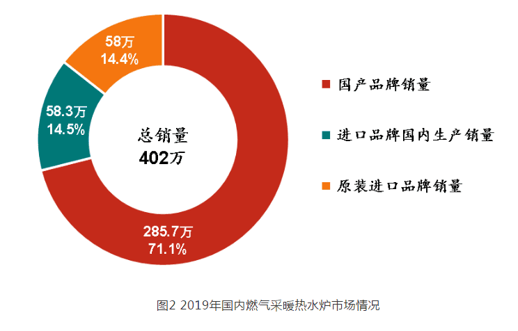 據(jù)統(tǒng)計, 2019 年中國市場燃?xì)獠膳療崴疇t總銷量為 402 萬臺,相比 2018 年( 320 萬臺)增加了 82 萬臺,增幅 25.6% 。其中,國產(chǎn)品牌國內(nèi)銷量為 285.7 萬臺,占全年總銷量的 71.1% ,相比 2018 年( 214 萬臺)增幅 33.5% ;進(jìn)口品牌在國內(nèi)生產(chǎn)的銷量為 58.3 萬臺,占全年總銷量的 14.5% ,相比 2018 年( 42 萬臺)增幅 38.8% ;原裝進(jìn)口品牌的銷量為 58 萬臺,占全年總銷量的 14.4% ,相比 2018 年( 64 萬臺)降幅 9.4% 。