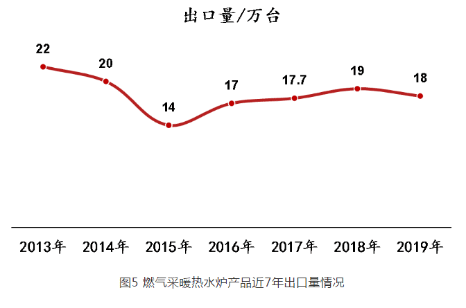 2019 年燃?xì)獠膳療崴疇t全年出口總量為 18 萬臺,相比 2018 年( 19 萬臺)減少 1 萬臺,降幅 5.3% 。圖 5 為燃?xì)獠膳療崴疇t產(chǎn)品近 7 年出口量分布情況。